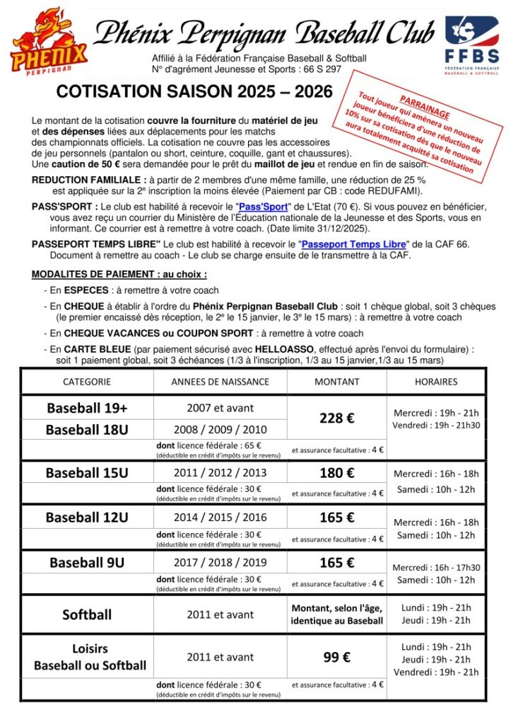 – CHEQUE à établir à l’ordre du Perpignan Baseball Club : soit 1 chèque global, soit 3 chèques (le premier sera encaissé dès réception, le 2e le 15 janvier, le 3e le 15 mars) : à remettre à votre coach